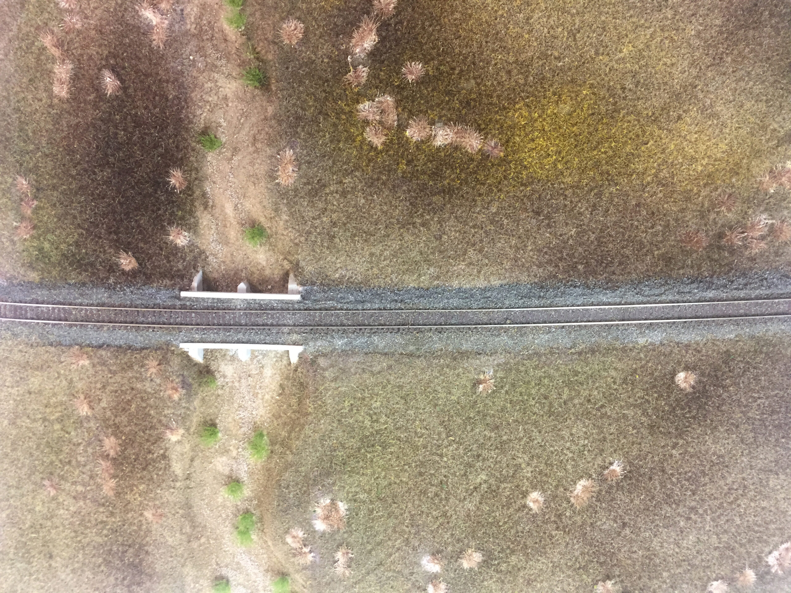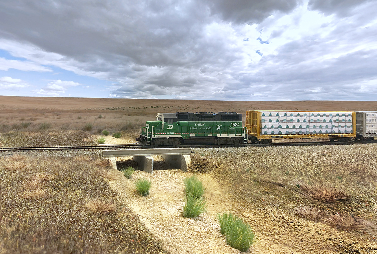 Für eine Ausstellungsanlage in Rodgau zur US-Convention war es nötig, zwei kleine Kurvenstücke zu bauen, um ein großes Oval schließen zu können. Links und rechts vom Modul Mesa angeordnet suchte ich auch Vorbilder nördlich und südlich der Ortschaft Mesa im Staat Washington und fand sie mit Hilfe von Google Streetview. Obwohl beide am gleichen Flussbett liegen, zeigt der eine ein ausgetrocknetes Bett, während der andere etwas Wasserfläche aufweist.