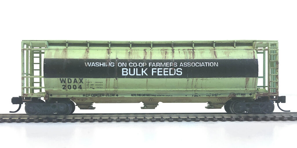 Bunt lackierte Wagen mit auffälliger Werbung verkaufen sich offenbar besonders gut, eine Verführung, bei der kaum ein Hersteller nein sagt. Als ich die Lackierung dieses Wagens von Bowser als frei erfunden erkannte, überlegte ich eine Umlackierung, kam aber am Ende auf die Idee, die hellgrüne Grundfarbe zu lassen und nur den Werbeauf-druck zu tauschen und zwar wieder gegen einen erfun-denen, diesmal aber passend zu einer Firma auf meinem Hafenmodul, die es jedoch im Unterschied zum covered hopper wirklich gab. Bei aller Phantasie: Text und Typo-graphie sind von einem Truck von Washington Coop übernommen.