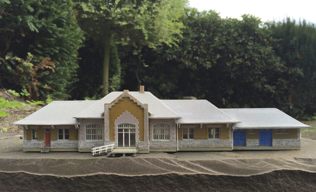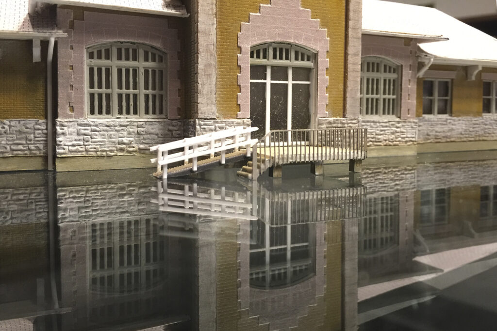 Die Details zum Abschluss haben dann noch mal lange gedauert. Da das Gebäude an einem leichten Hang liegt, führt eine Treppe ebenso wie eine Rampe für Rollstuhlfahrer zum vorderen Eingang. Für das Metallgeländer habe ich ein Ätzteil modifiziert, das Holzgeländer der Rampe aus Profilen geklebt. Dachrinnen und Regenfallrohre aus Halbrund bzw. Rundprofilen konnten auch wieder weiß bleiben.